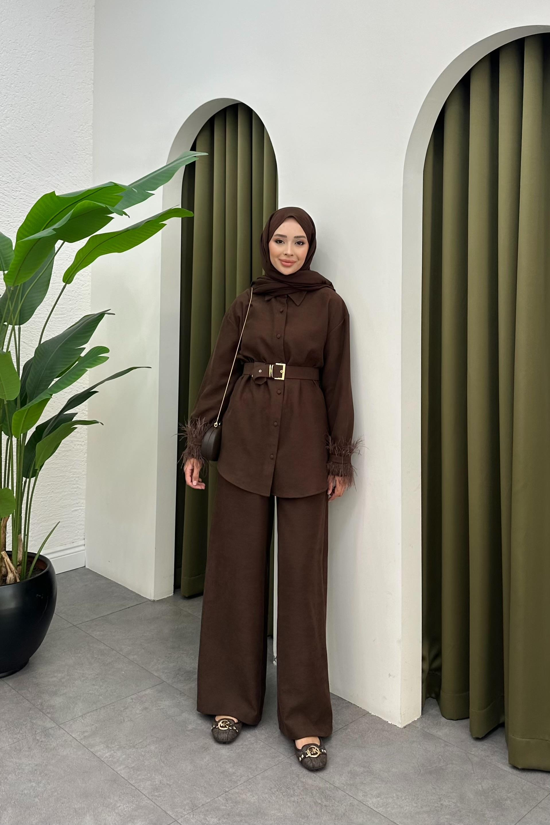 Monreo Tüy Detay Pantolon Takım - KAHVE